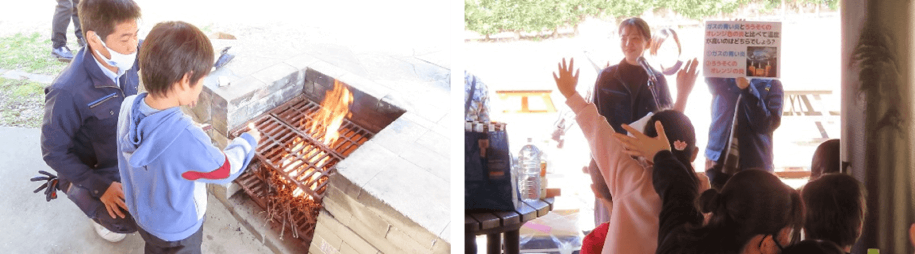 当日は、ミライフ西日本のスタッフ指導の下、マッチを擦って薪に火をつける火起こし体験や、食育・防災クイズに加え、株式会社パロマにも協力いただき、災害時にも役に立つコンロを使用したお米炊き体験も実施しました。